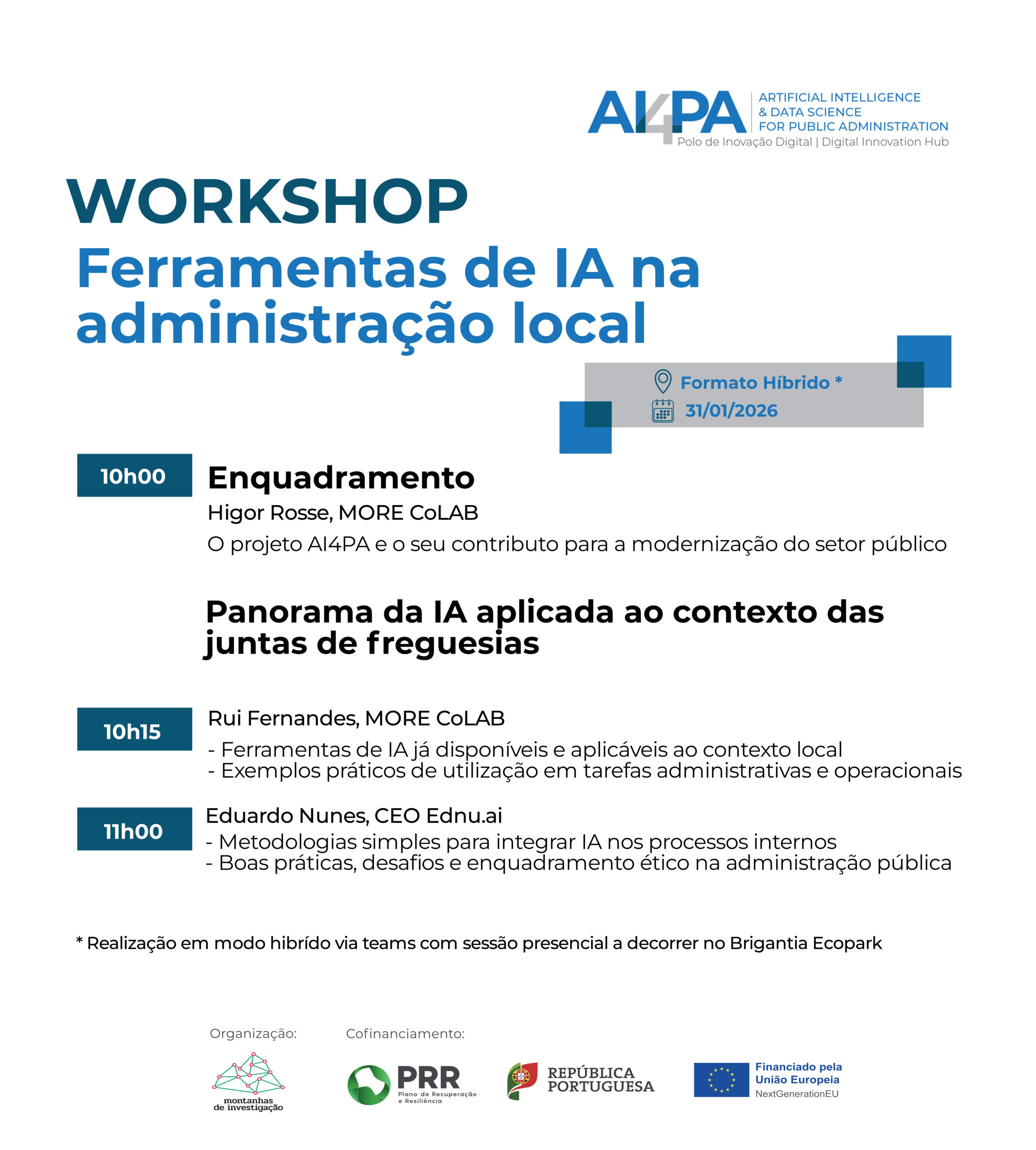 O workshop será organizado pelo parceiro MORE CoLAB, no dia 31 de janeiro de 2026, com início às 10h00. A sessão insere-se na “Rede Nacional de Polos de Inovação Digital (DIH)” e é promovida pelo Polo AI4PA, com o objetivo de reforçar a capacitação digital de empresas e entidades públicas.
